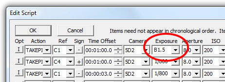 New in version 3.2 is full support for Bulb mode, allowing arbitrary exposure lengths. To create a bulb exposure, simply type the letter 'B' followed by the duration in seconds into the Script Editor. Bulb mode has a precision of about 0.01 seconds, so only exposures longer than 1/10 second are recommended.