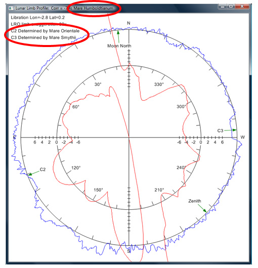 Listed in the upper left of the window are the names of the features that determined second (C2) and third (C3) contacts. In this case, the last bit of light at second contact was through the depression of Mare Orientale and, for C3, Mare Smythii lets through the first light of the Sun, ending totality.