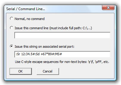 For the truly advanced user, arbitrary strings can be programmed to be transmitted out a serial port during a script. One possible use is to repoint a telescope, perhaps to build up a high resolution mosaic. The example string shown below could command a Meade LX200-compatible telescope to slew to a right ascension of 12h 34.5m and a declination of +67°89'.